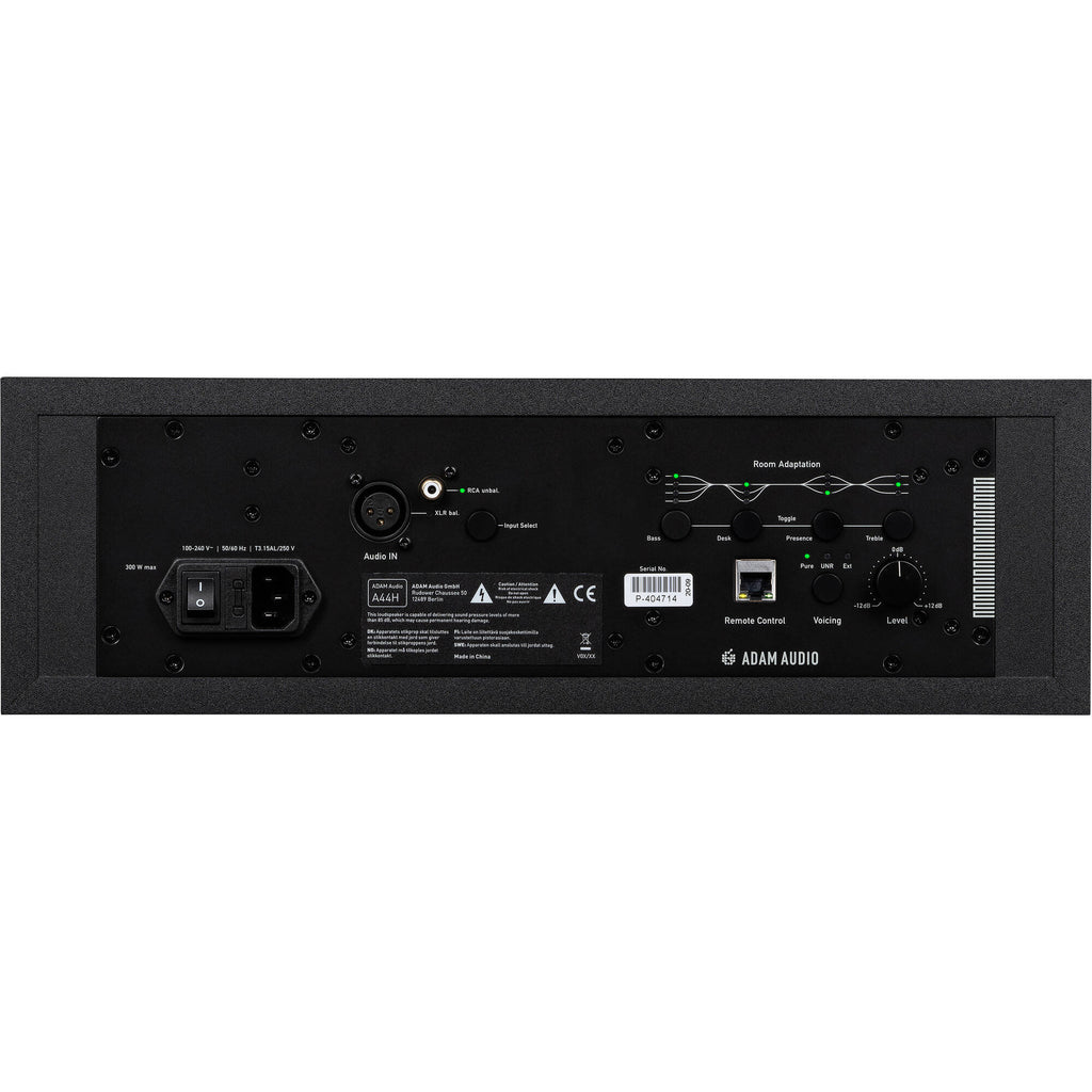 Audio professionals in need of a low-profile, high-quality nearfield monitor will be impressed with the Adam Professional Audio A44H, a professional, dual 4" 2-way studio monitor speaker that delivers rich, spacious, and enveloping sound, well suited for small studio spaces, short listening distances, and immersive multispeaker configurations. With a width of 19", the A44H can sit on a standard rack shelf or be mounted above or below a display. It can also serve as a center speaker in immersive and 3D speaker configurations.