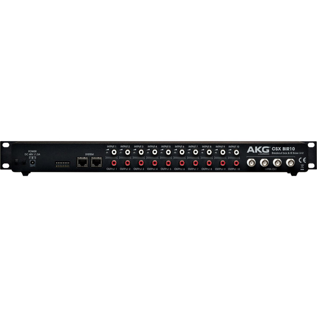 The system is designed to operate in two modes, both feeding up to 10 channels. First, the CSX BIR10 can be used as part of AKG's CS5 system. In this mode the unit acts as infrared modulator and/or as breakout box to provide channels of the CS5 data ring to external devices via RCA connectors on the back panel. Second, as a stand alone IR system, to feed external devices (e.g. a wireless system) These signals cannot NOT be fed into a CS5 data ring.