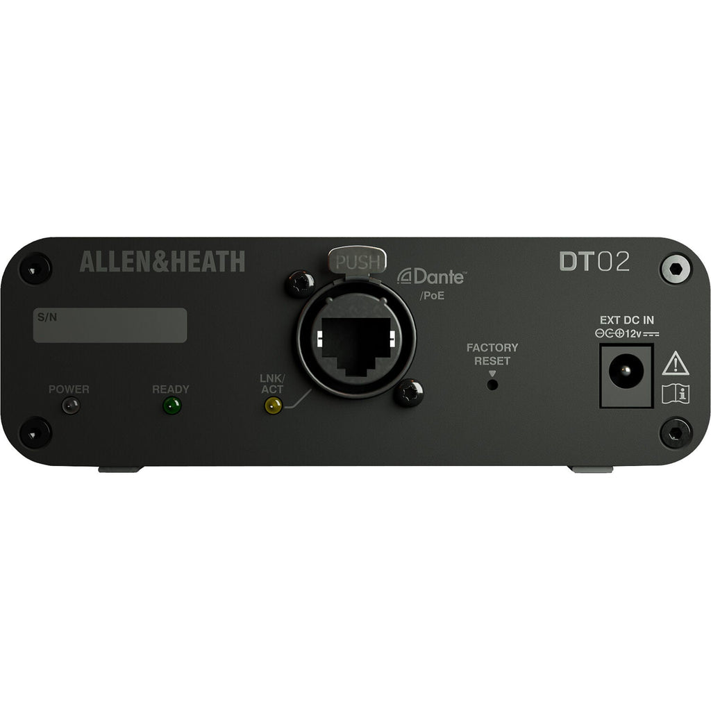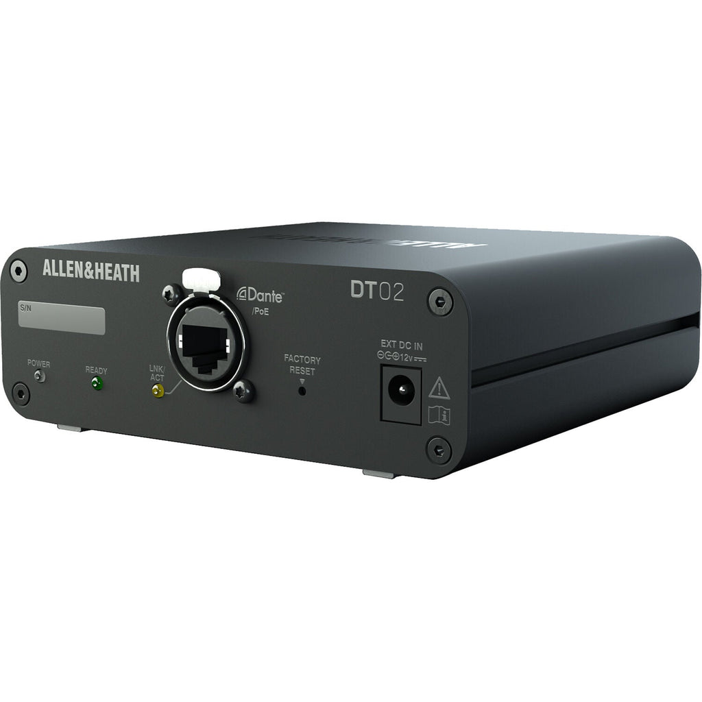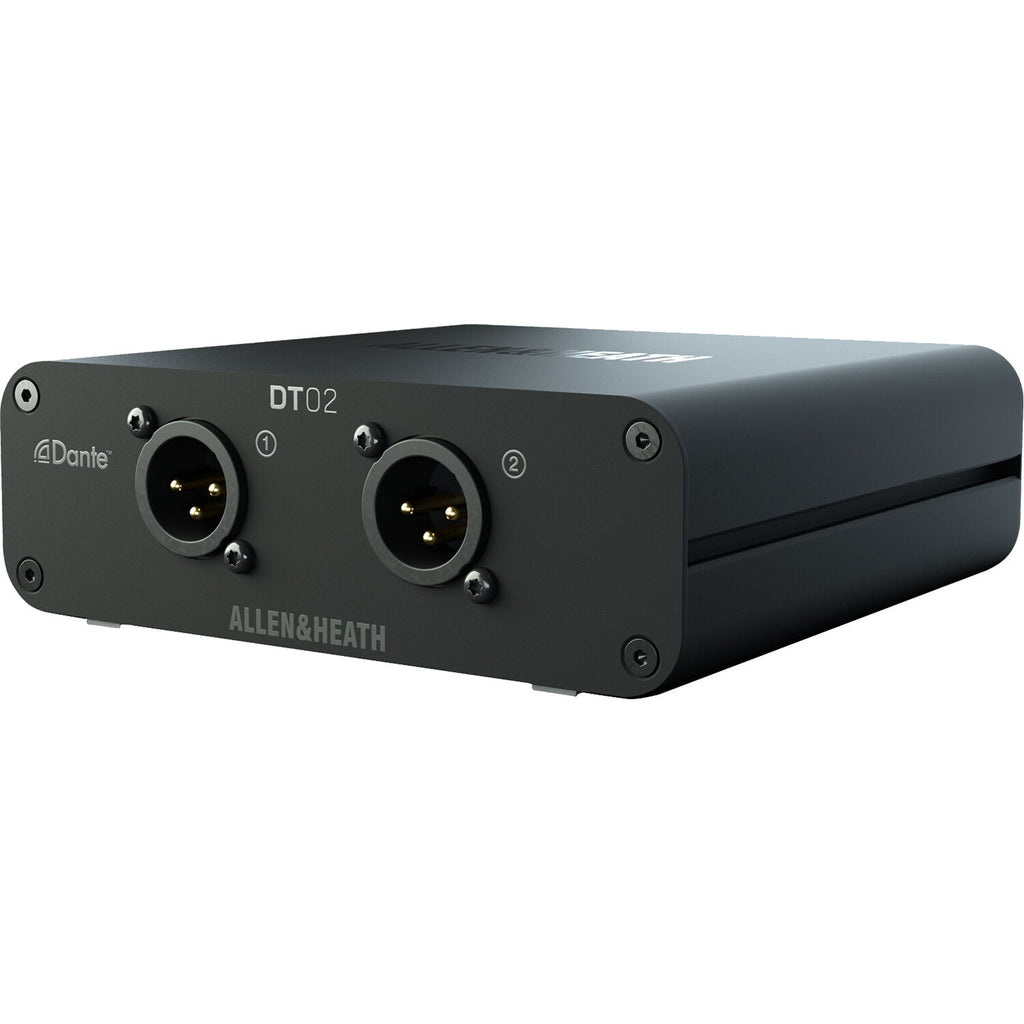 DT02 is a cost-effective, compact 48kHz/96kHz Dante interface enabling 2x XLR outputs wherever you need them on your Dante network. Ideal for a wide variety of fixed installation and AV hire / portable applications, DT02 can be used with any Dante-equipped Allen & Heath mixer or AHM system, as well as with third party Dante systems.