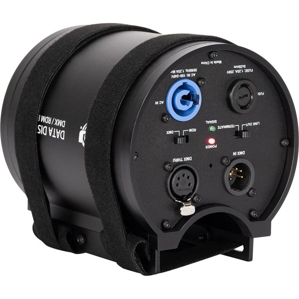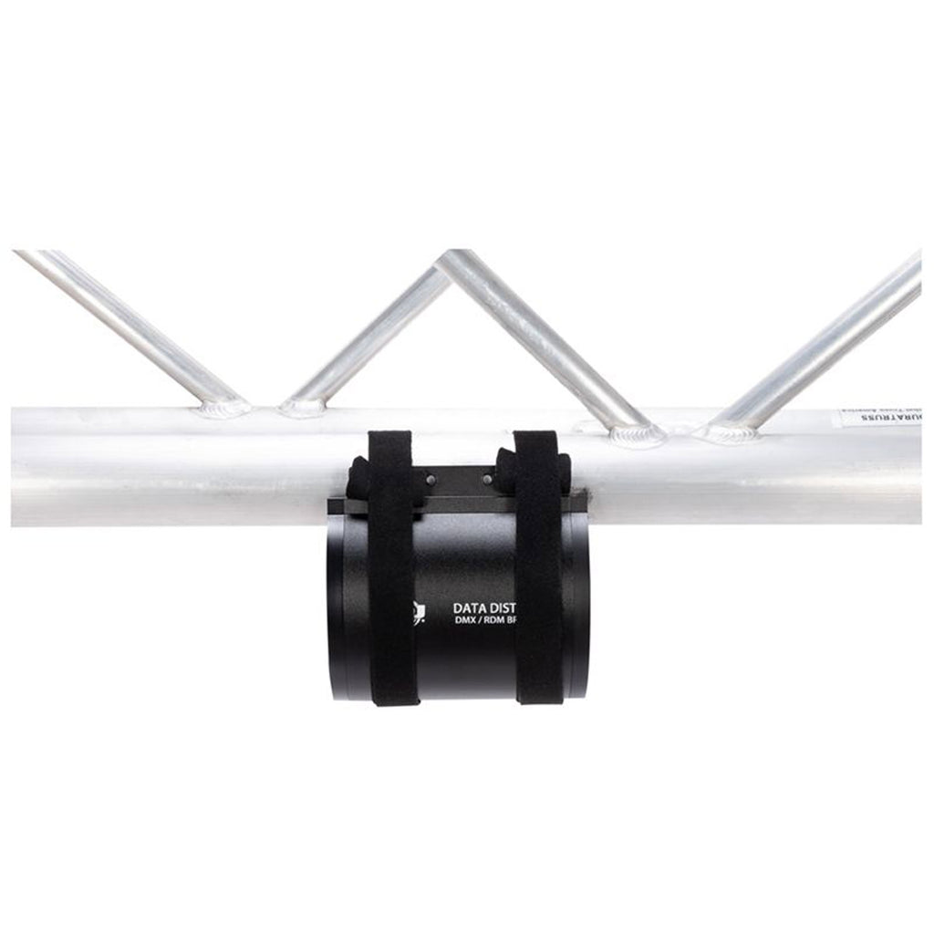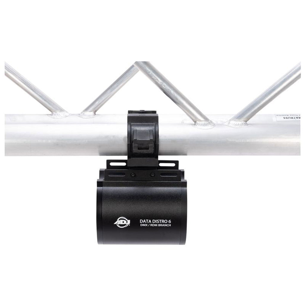 The ADJ Lighting Data Distro 6 is a versatile and compact solution for streamlined DMX512 and RDM signal distribution. Designed for seamless integration into your lighting setup, this data splitter ensures reliable and convenient hanging with 1 Truss Mount featuring two Velcro Straps or M10 Screw Clamp (clamp not included). Its robust physical configuration includes 1x indoor 5-pin XLR input, 1x indoor 5-pin XLR thru, and 6x indoor 5-pin XLR outputs. Equipped with a Link Out Termination Switch and a DMX/RDM Protocol Switch, it also features an indoor locking power socket for added security.