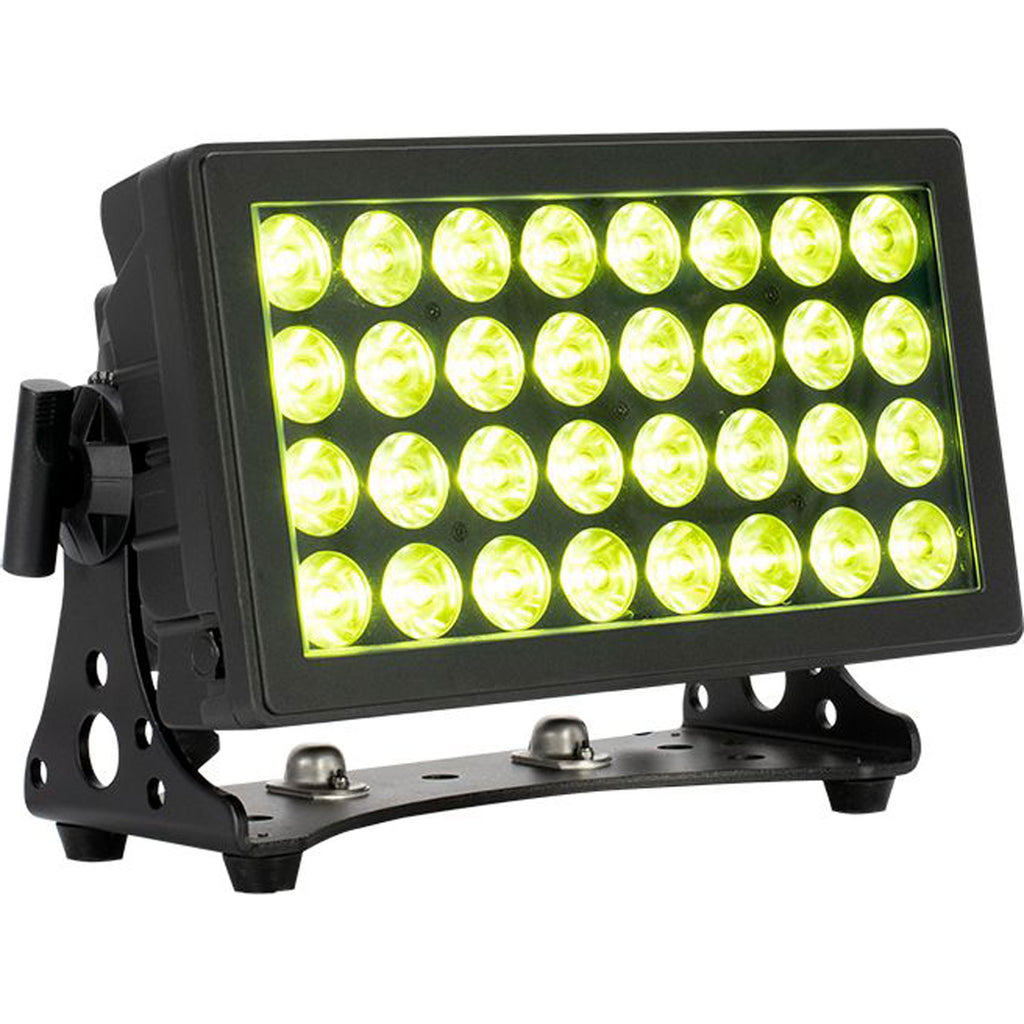 ADJ's Encore LP32IP is a multi-functional IP65-rated professional wash lighting fixture. It features 32 x 20-Watt 4-in-1 (red, green, blue, lime) color mixing LEDs arranged into 8 individually controllable sections. The fixture offers a concise beam angle of 11-degrees, which can be widened to 25-degrees using the included diffusion filter and magnetic filter frame. Suitable for use both indoors and outdoors in any weather, this versatile fixture can be used as a color wash, blinder, or strobe.