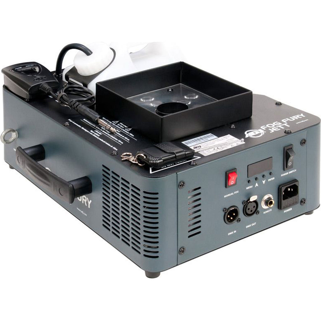 The ADJ Fog Fury Jett is a high velocity vertical Fog Machine that mixes color into the fog from 12x 3-Watt RGBA LEDs. With new advances in ADJ's heater technology, the Fog Fury Jett produces a dry even blast of fog over 25 feet (7 meters) in the air. It has a special heating element design that uses an oil type transmission throughout the pipeline to prevent clogging. It is also equipped with a high performance Italian pump system for optimum output. ADJ's Electronic Thermo Sensing (ETS) technology is on-board to maintain optimum heat levels with short warm-up time between fog blasts.