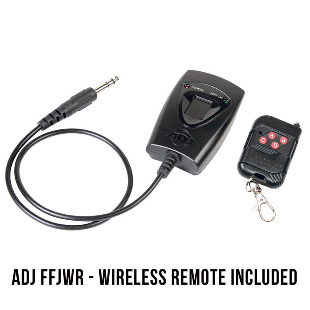 The Fog Fury Jett may be use vertically or horizontally. The reservoir tank may be mounted in the front or rear of the unit so the machine may be pointed up or down. The ADJ FFJWR wireless remote comes included with the Fog Fury Jett.