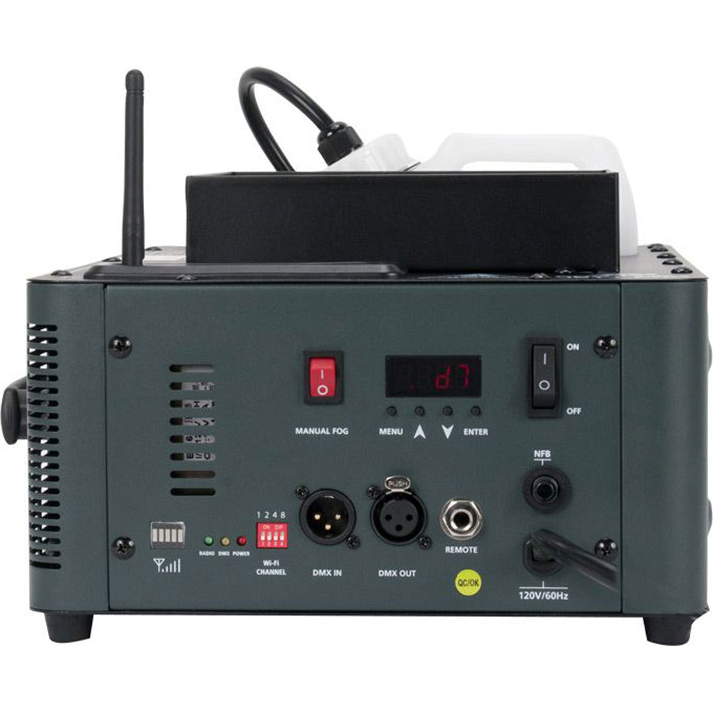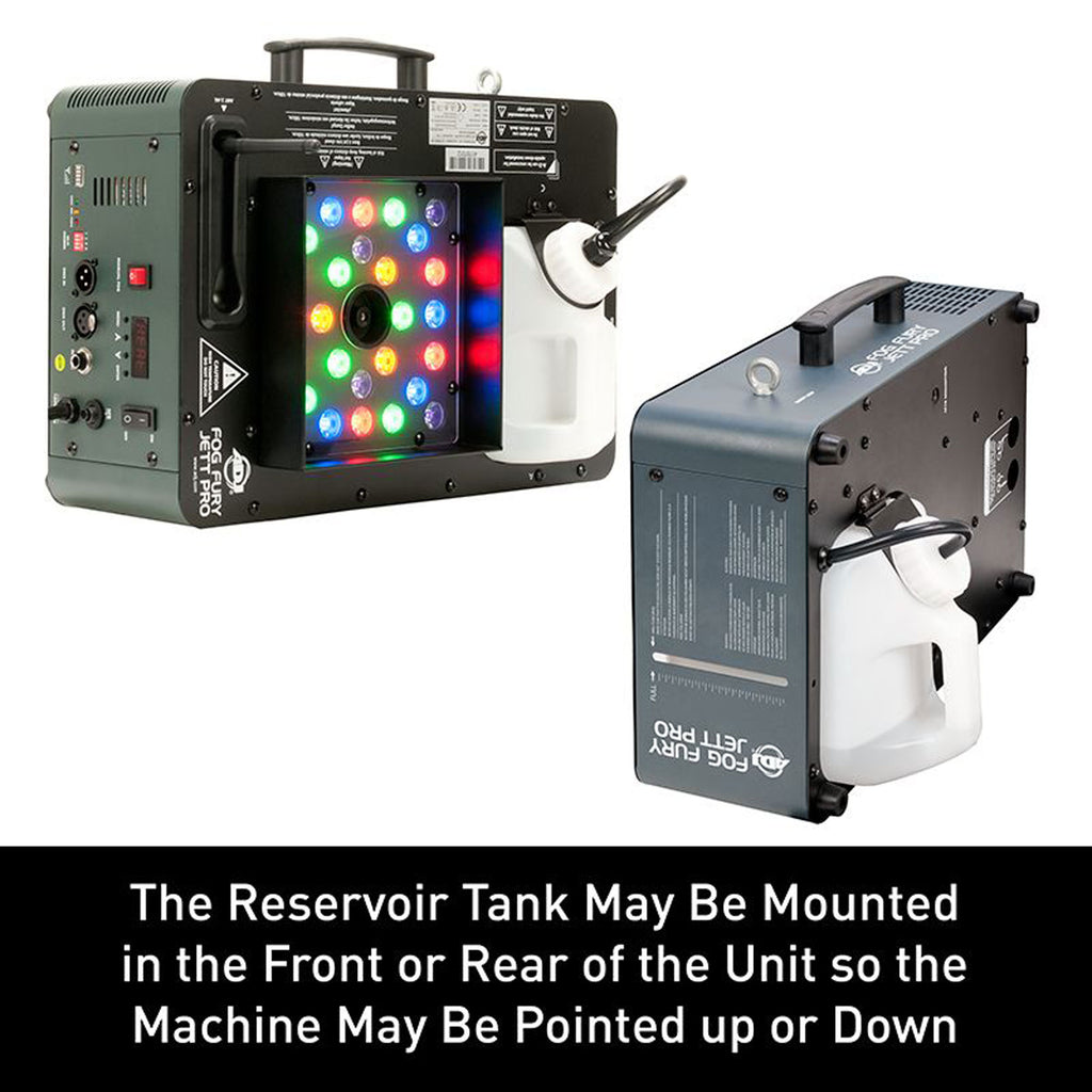 The Fog Fury Jett Pro may be use vertically or horizontally. The reservoir tank may be mounted in the front or rear of the unit so the machine may be pointed up or down. Control options included 3-pin and 5-pin DMX In/Out connections, ADJ's WiFLY EXR wireless DMX on-board, plus the ADJ FFJWR wireless remote comes included in the box.