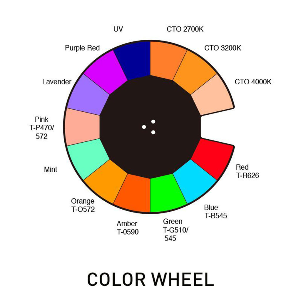 - 12 Position Color Wheel (Including: UV + CTO: 2700K, 3200K, 4000K)
