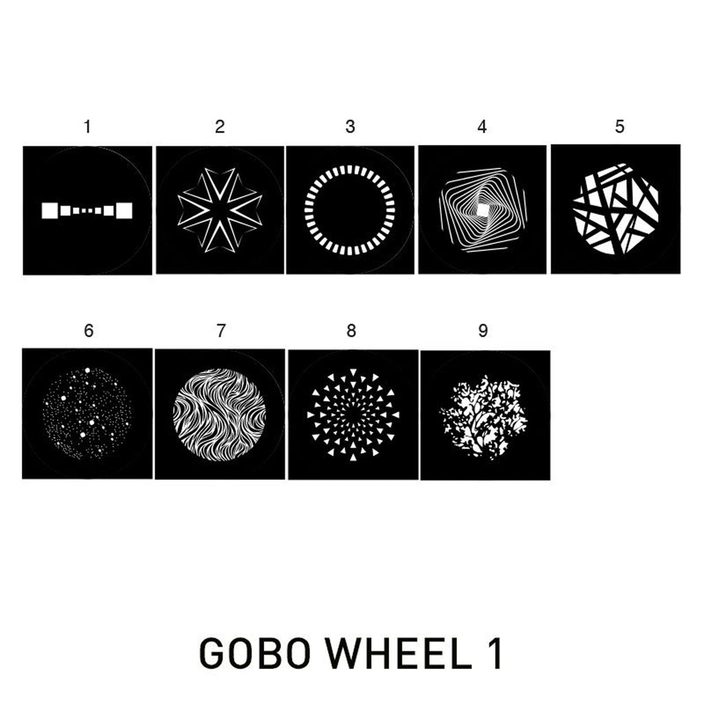 - GOBO Wheel 1: 9 Interchangeable-Rotating / Indexing Glass Black & White Gobos