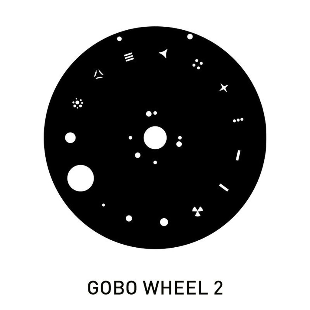 - GOBO Wheel 2: 14 Static-Stamped Metal Gobos (Including 4 beam reducers)