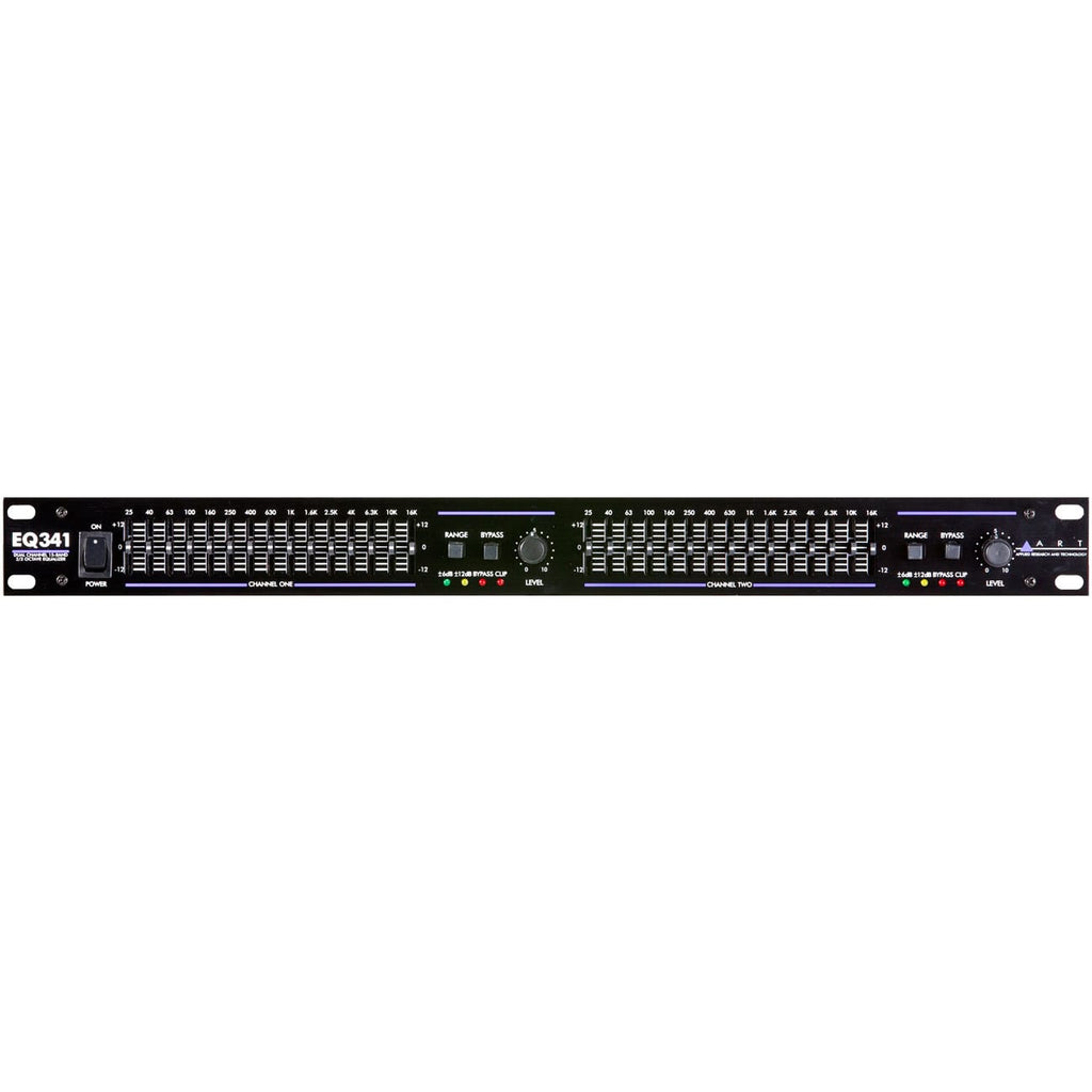 ART's 341 Dual Channel 15 band 2/3 octave graphic equalizer features: constant Q circuitry with a 3% center frequency accuracy, 20mm center detent sliders, selectable boost/cut range of 6dB or 12dB, active balanced and unbalanced input and output connect-ions, variable input level control, clip level indicators, ground lift switch, internal power supply and selectable line voltage switch. A range control switch is provided allowing you to set the maximum boost or cut for each band of equalization to either 6dB or 12dB. Each channel has its own bypass switch with LED indicator. The rugged, all-steel constructed chassis occupies 1U rack space and is intended for installation in standard 19" equipment racks.