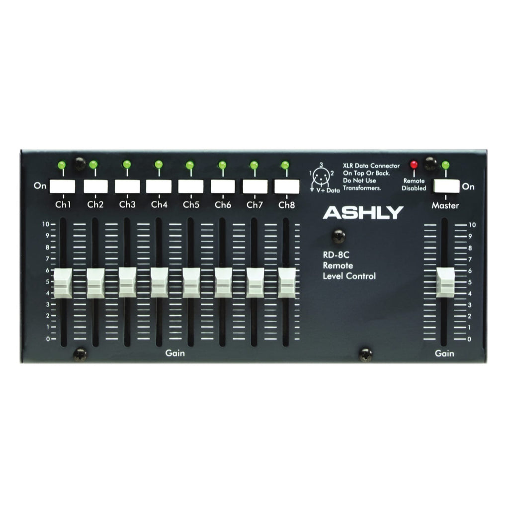 Control your system from any location with our remote controls. RD-8C is a hard-wired desktop programmable remote fader controller for Ashly amps and processors that have DSP and a serial data connector. RW-8C is the wall-mount version. Using Protea NE Software, each fader is assigned to adjust the level of one or more input or output channels or control the DSP matrix mixer. A master fader controls the overall level of all faders.