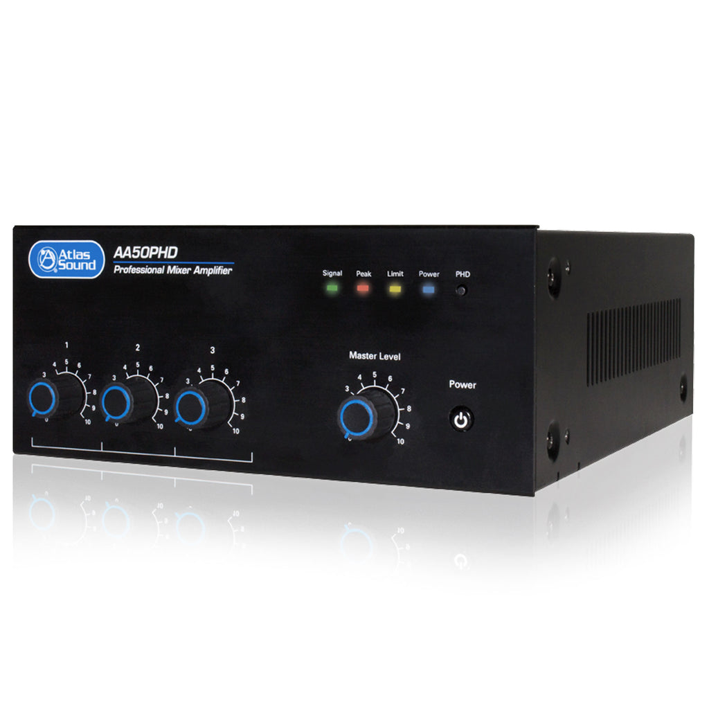 With one microphone/line input and three stereo line inputs, the AA50PHD will accommodate a variety of input sources including paging microphones, media players, and digital music receivers. The AA50PHD includes a patent pending automatic system test, the Push Here Diagnostic (PHD). The PHD button is designed to check the connected speaker lines for wiring and impedance errors. This test can be activated once all speakers are connected and the circuit automatically verifies that the attached speakers' tap settings do not exceed the amplifier's rated power, no speakers are mistakenly tapped at 8Ω, and the speaker wire is free from shorts. The unit also incorporates a Remote Input Selection and Remote Level Control feature that allows the integrator to use a remote wall plate (Atlas Sound model WPD-RISRL) and allow the user to select the input and adjust the volume from that wall plate up to 200 feet from the amplifier.