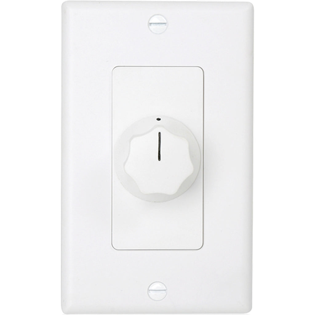 Decora style High-quality auto transformer series provides the advantages of excellent frequency response, low insertion loss and reliable performance for volume control application in 25 and 70.7-volt systems. Attenuation is accomplished in ten make before break steps plus positive off position. (No stop between maximum and off position to prevent switch damage). Contacts are silver plated for noise-free operation. Features a removable terminal block, and comes complete with white and ivory plastic plates with matching skirted knobs.