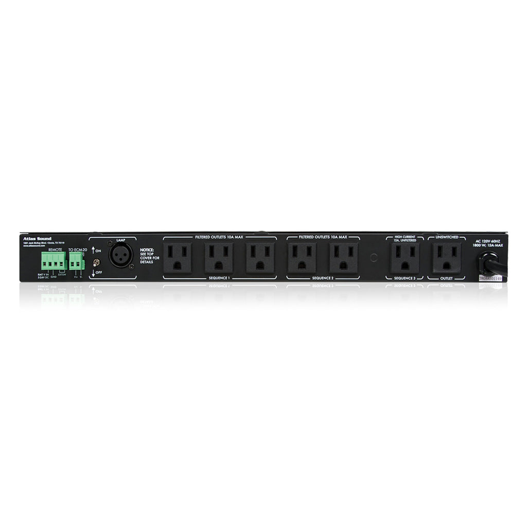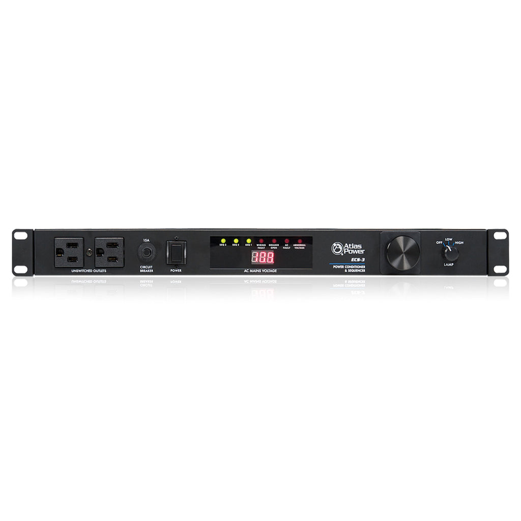 AC Mains Voltage can be monitored via the front panel from the precision Digital Volt Meter. To light your rack, the ECS-3 has incorporated a front panel pull-out dimmable LED tube light. The rear of the rack can be illuminated by the optional 16" gooseneck LED lamp connected via an XLR style socket. LED lamps are far superior in longevity along with heat reduction when compared to traditional incandescent lamps and the XLR base mounts are also superior to the commonly used BNC type base. If a 15A AC Mains power source is not enough to meet the amperage demand of your system, the ECS-3 provides a sequenced 24VDC output that can be used to trigger other devices such as the AtlasIED ECM-20SH 20A stand alone AC power module.