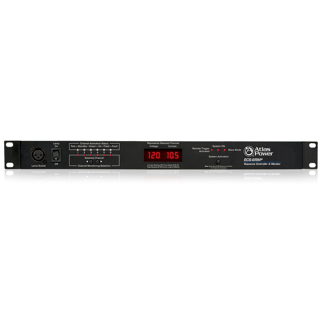 The ECS-6RM modular system has been designed to meet most installation requirements for AC power distribution, equipment power conditioning and surge suppression protection. The compact 1 RU unit features six sequential timing sections that can be activated via the unit, or remotely. Up to three ECS-6RM units can be daisy chained together with independent trigger timing settings giving you a total of 18 sequence triggered outlets. The ECS-6RM unit is the activation controller/monitor portion of the system and requires a 120V AC Mains ECM (Electrical Controlled Module) module for each triggered output. A variety of remote ECM AC modules are available to meet different installation requirements.
