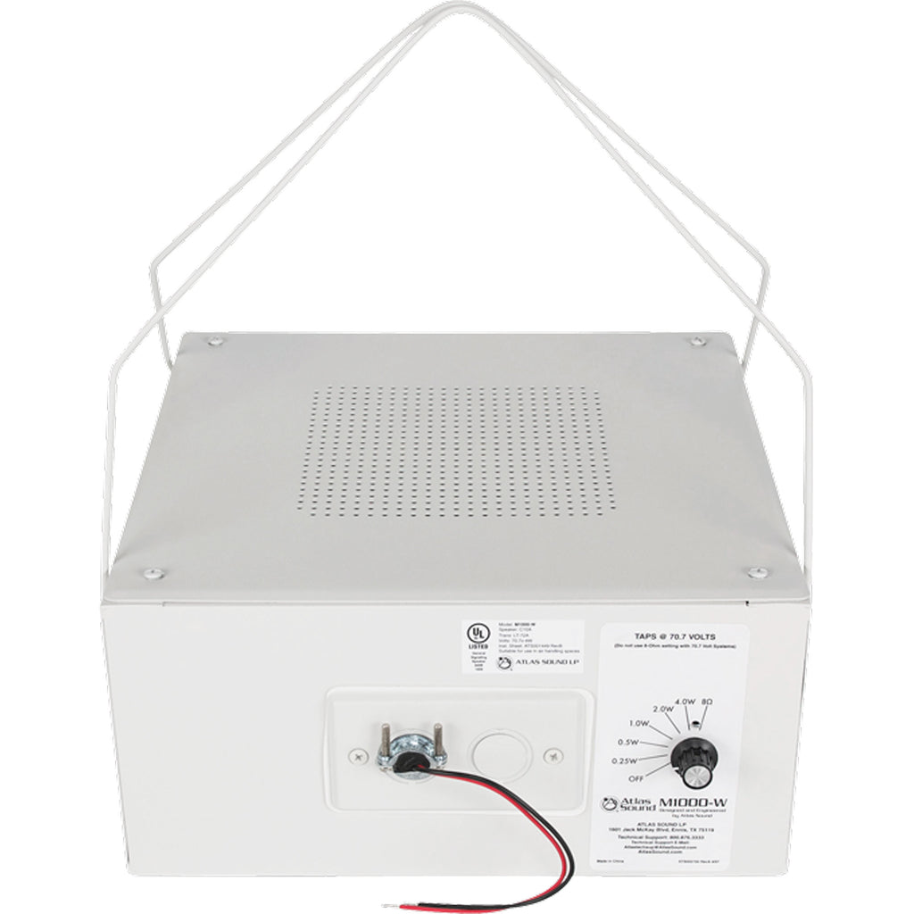The exclusive AtlasIED EZ hang brackets simplify installation. This innovative suspension system utilizes (2) collapsible plated hangers configured to allow quick upward, downward, or side firing installation. The hangers are factory-installed on the unit and fold flat for shipping. To meet most any local code requirement, the M1000-W includes an innovative cover containing both knockouts and a strain relief. This system will allow the use of rigid or flexible conduit (if required) and easily accommodates "through" connections on the removable plate. UL 2043 listed for use in air handling spaces.