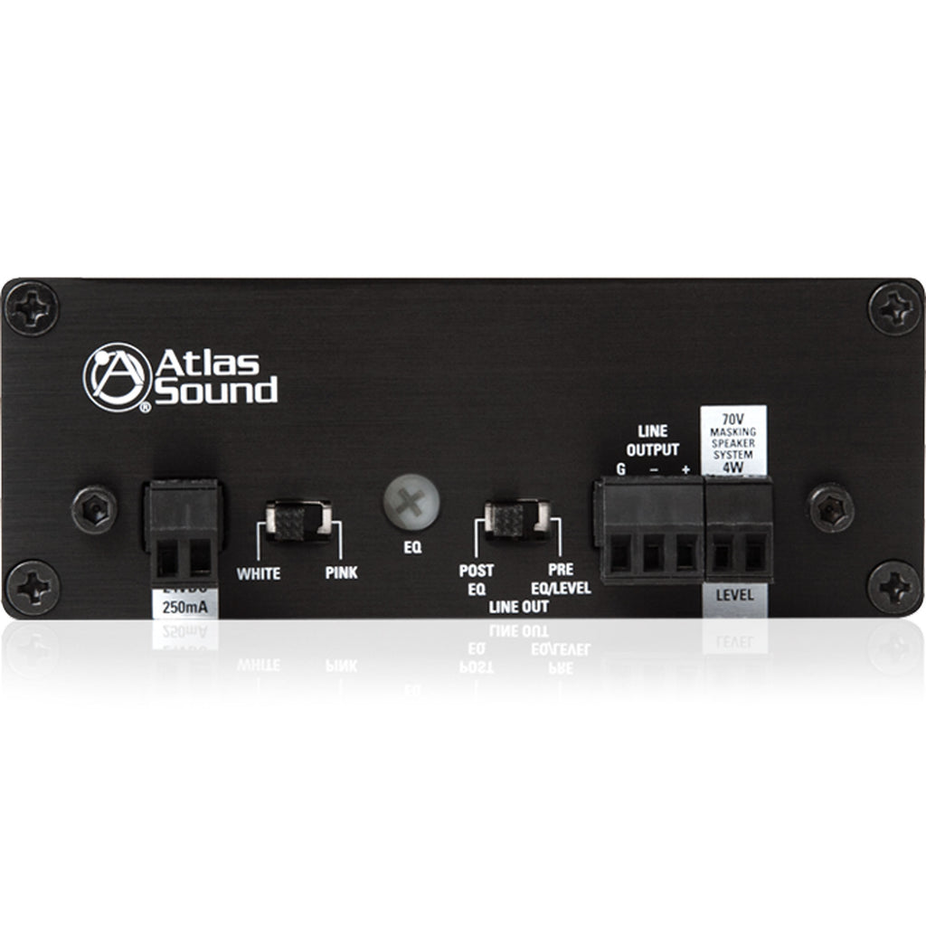 Additionally, a 4W, output is provided to power up to six masking loudspeakers tapped at .5W each. A variable hi-cut filter with operating range between 1kHz and8kHz at a slope of 6dB per octave supports equalization requirements for Sound Masking systems. Both outputs may be used simultaneously allowing large zones to be addressed with external equalization and amplification while a smaller zone is powered by the internal amplifier with spectrum control provided by the hi-cut filter.