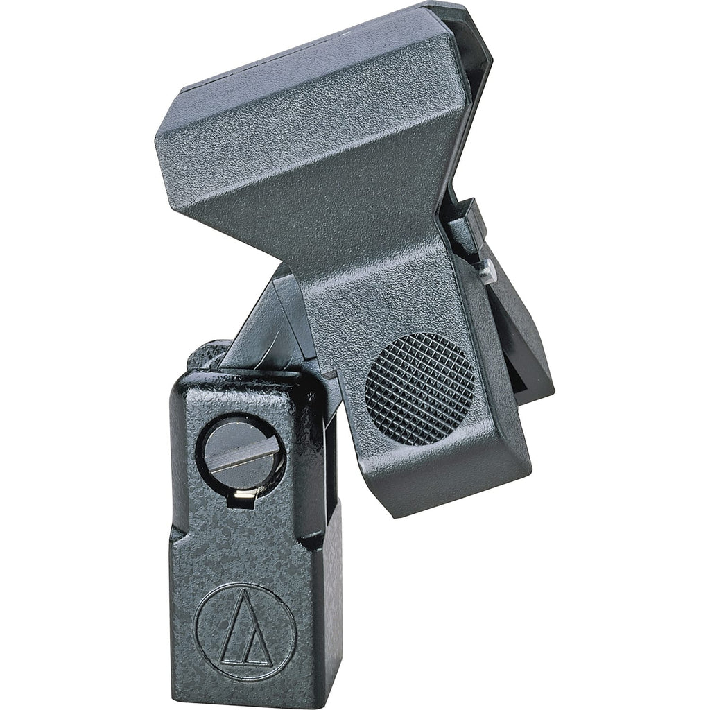 The Audio-Technica AT8407 is a universal spring-loaded microphone clamp. The "clothes pin" clip design accommodates both tapered and cylindrical microphones. The clamp is compatible with 5/8"-27 threaded stands and features a rugged metal base.