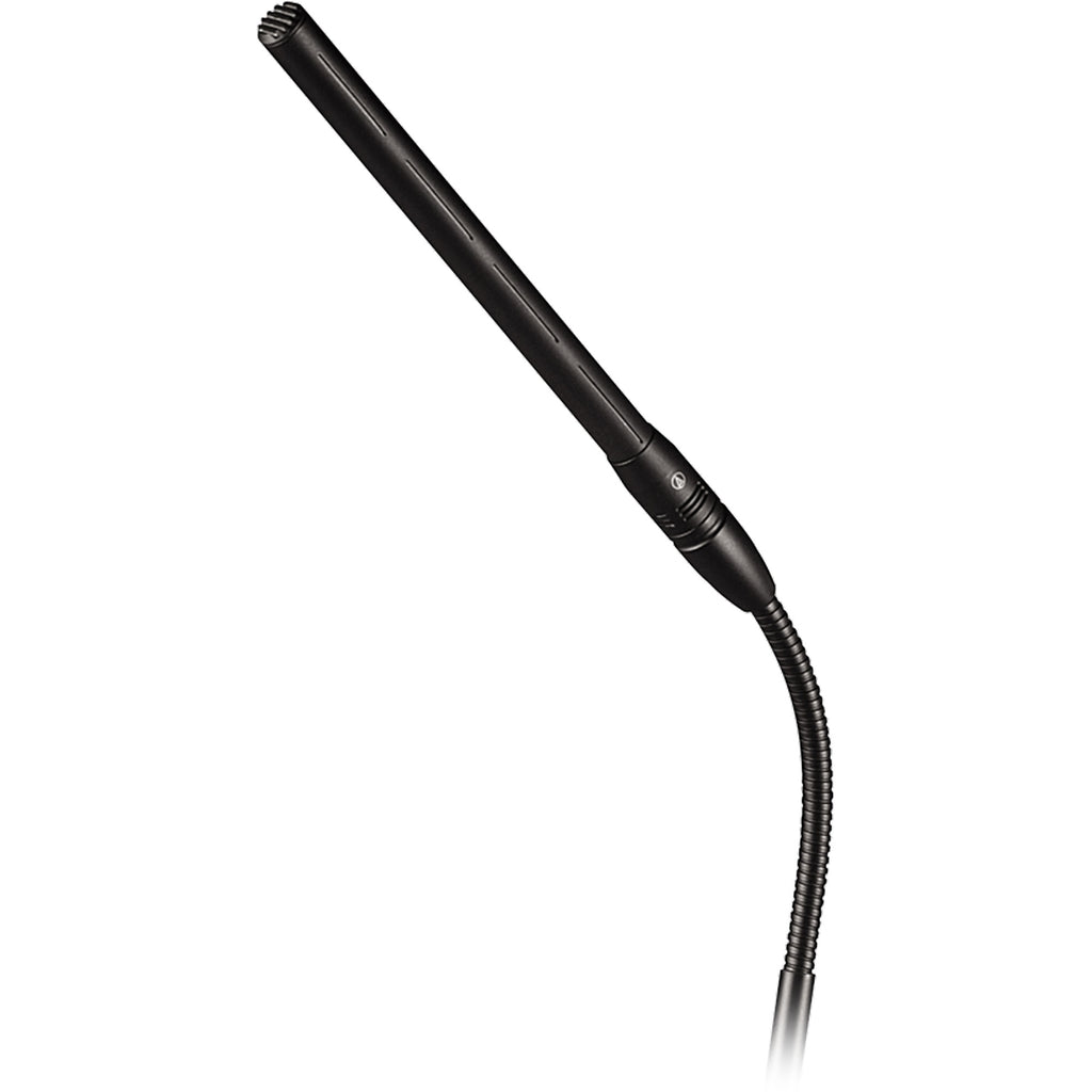 Featuring Audio-Technica's UniLine line-cardioid element with a tightly focused 90º acceptance angle, the U857QU quick-mount gooseneck condenser microphone is designed to plug directly into a panel- or desk-mounted XLRF-type connector; it is 19.17" long. Its ultra-flexible, robust gooseneck permits easy adjustment into desired shape while resisting inadvertent repositioning. Featuring UniGuard innovations that offer unsurpassed immunity from radio frequency interference, the U857QU accepts interchangeable elements, available in cardioid, hypercardioid, omnidirectional and UniLine line cardioid polar patterns. The phantom-powered microphone also offers an 80 Hz low-cut UniSteep filter that reduces pickup of low-frequency ambient noise.