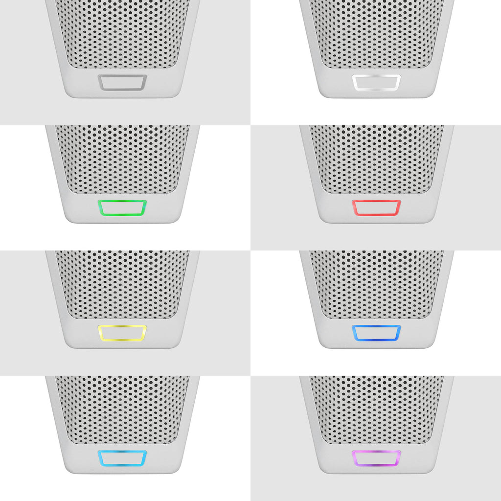 Integral, phantom-powered, two-state RGB LED indicator displays on/off status of microphone