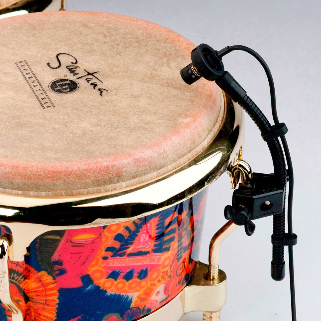 This mic is targeted for hand percussion instruments and drum instrument applications. Housed in an aluminum ring and isolated by means of a rubber shock mount system, The MicroHP attaches to the lug of an instrument via the Audix DCLAMP mounting system.