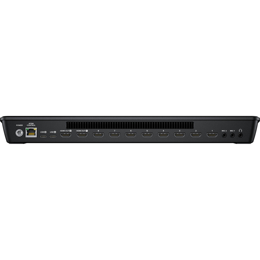 - The front panel includes easy-to-use buttons for selecting sources, video effects, and transitions. The source buttons are large, allowing you to operate them by feel. Included on the ATEM Extreme ISO are buttons for audio mixing, recording, and streaming control, as well as output selection buttons that let you change the video output between cameras, program, and multiview. On the rear panel, there are HDMI connections for cameras or computers, extra microphone inputs, USB for webcam out, plus an HDMI "AUX" output for program video.
