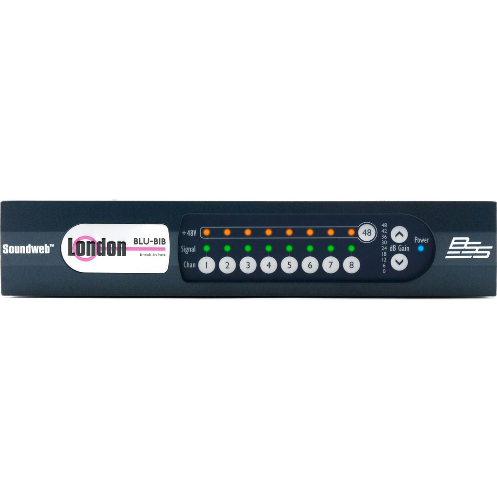 The Soundweb London BLU-BIB or "break-in box" offers 8 channels of analog audio input expansion via the Soundweb London high bandwidth, fault tolerant digital audio bus.