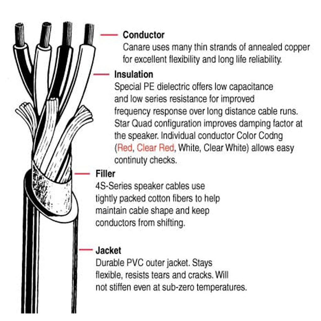 Speaker cable must accommodate relatively high signal levels, typically tens to hundreds of watts of RMS power. Electromagnetic interference (EMI) can radiate from these speaker lines directly into adjacent low voltage cables (i.e. microphone, video lines, etc.). Canare solves this problem by using a 4-conductor "Star Quad" configuration in all of our 4S Series speaker cables. Because every conductor is located the same distance from the center, the opposing magnetic fields are cancelled out. Attenuation of magnetic field radiation is superior when compared to a standard 2-conductor speaker wire.