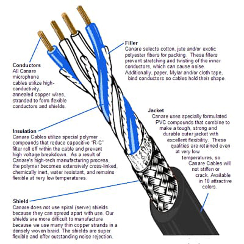 The premier Star Quad cable for all handheld microphone applications. Flexible, satin smooth to the touch and extra strong, this standard diameter, 21 AWG cable fits perfectly in all XLR-type audio connectors. Forty separate strands in each conductor eliminate breakage due to flexing. Available in 10 beautiful matte finish color jackets.