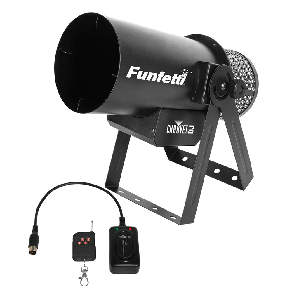 The Funfetti Shot is an event-ready confetti launcher and its easy, single person setup and operation make it perfect for concerts, parties or other special events. Just add confetti! No compressed air or CO2 required. The Funfetti Shot works with Funfetti Shot Refill - Color, Funfetti Shot Refill - Mirror, and Funfetti Shot Refill - UV, as well as most other confetti types. It is easily controlled from the display, the included wireless remote or DMX. The Funfetti Shot includes a double bracketed yoke for easy floor mounting or hanging on TRUSST and fits best in the CHS-50 VIP Gear Bag.