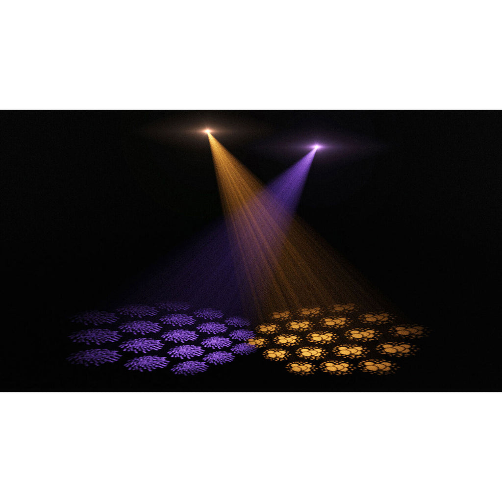 - Compact LED effect light fitted with a 100W LED projects multicolored, rotating gobos