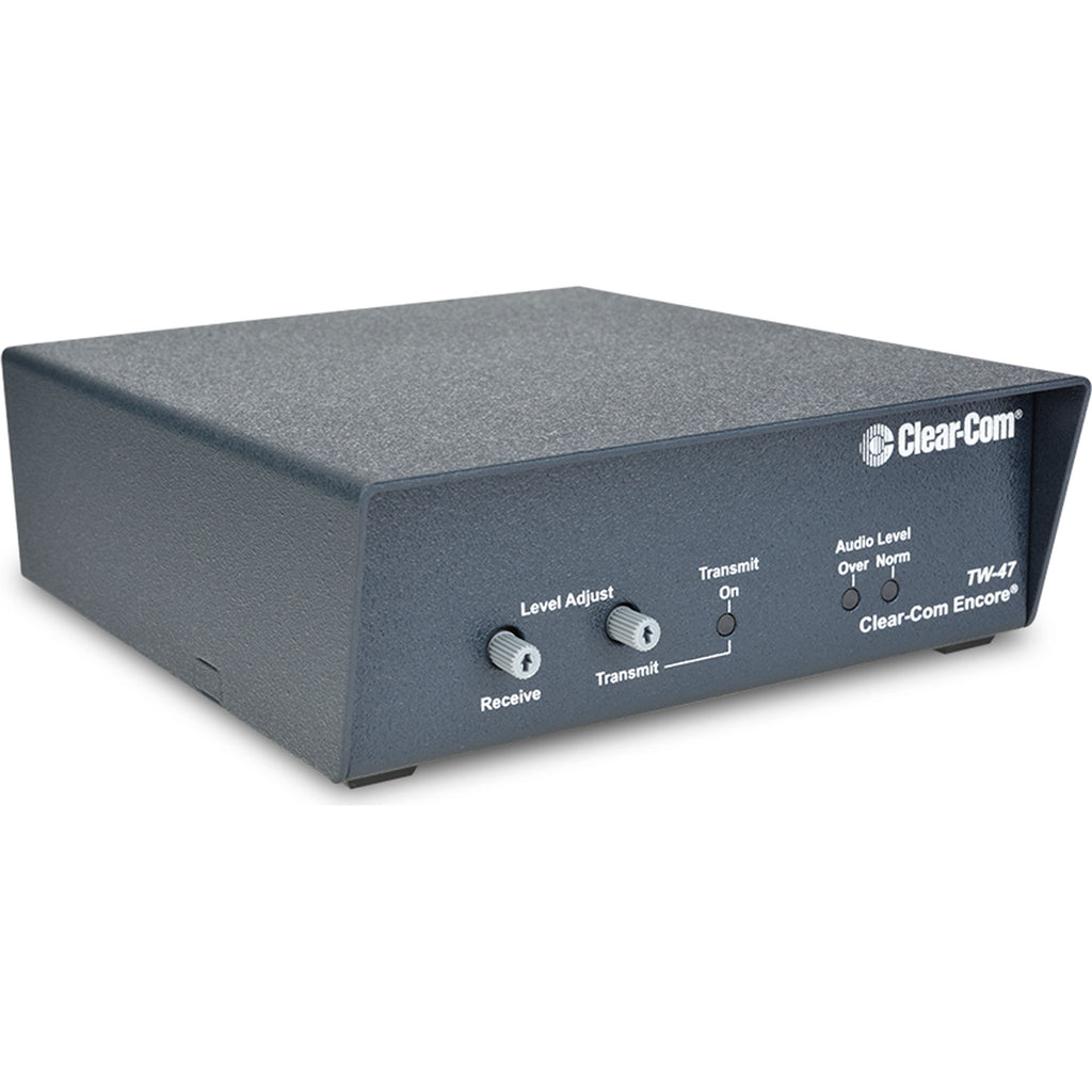 Compatible with both Clear-Com and RTS, TW-47 connects virtually any set of walkie-talkies to anyone on the wired partyline intercom; simply use one walkie-talkie as a basestation. The base station radio is keyed from the intercom call signal. Extensive RF and EMI isolation prevents interference from entering the intercom system. Separate transmit and receive level controls are provided, along with audio level and transmitter keying indicators. The stand-alone interface is powered by the intercom line.