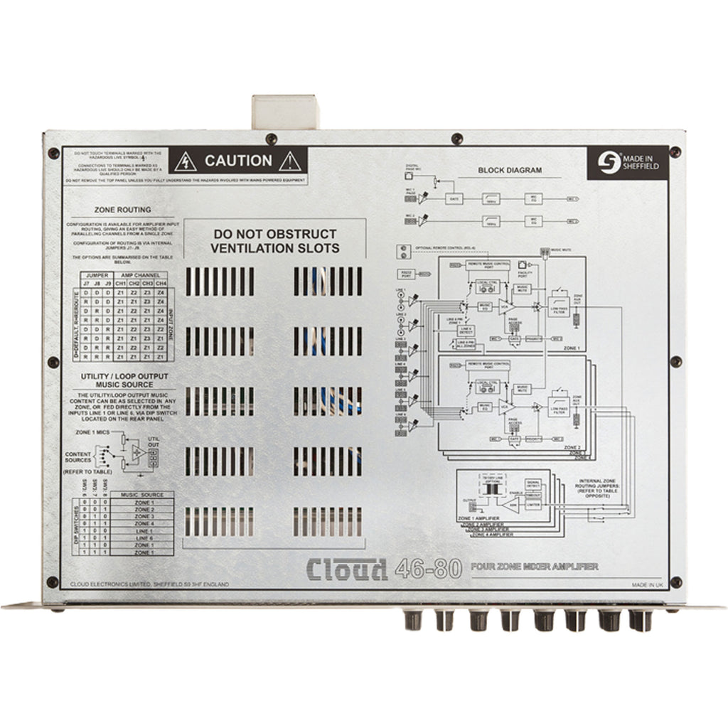 The Cloud 46-80 is a versatile, four-zone, rack-mounting (2U) audio mixing amplifier. It combines simple control of background music, microphone paging and power amplification for up to four zones in a single unit. It has extensive remote control facilities and is ideal for installation in premises such as pubs, bars, hotels, clubs, leisure and fitness centres, retail and other commercial premises, etc.
