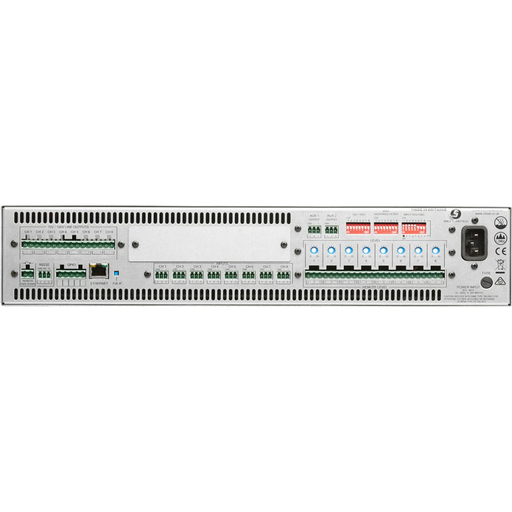 The CV-Digital series amplifiers are compatible with standard Cloud RL Series remote level control plates. DSP parameters are accessible via RS-232 and Ethernet, for interfacing to third-party control systems. A 3-way GPIO port can be configured for external master mute and fault condition signalisation