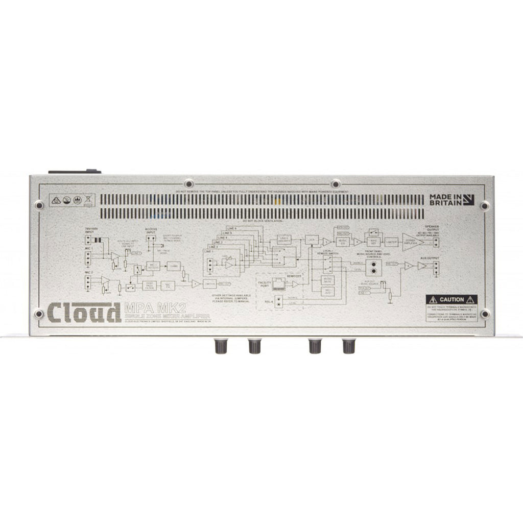 The Cloud MPA Series is world-class; premium integrated Mixer Amplifier which provides a complete audio solution for Houses of Worship, retail outlets, hotels, licensed premises and other spaces where music, announcements and/or flexible paging are required. It combines the functions of a two-channel microphone mixer with full paging facilities, a six-input music source selector and a mono power amplifier in a single compact 1U unit.