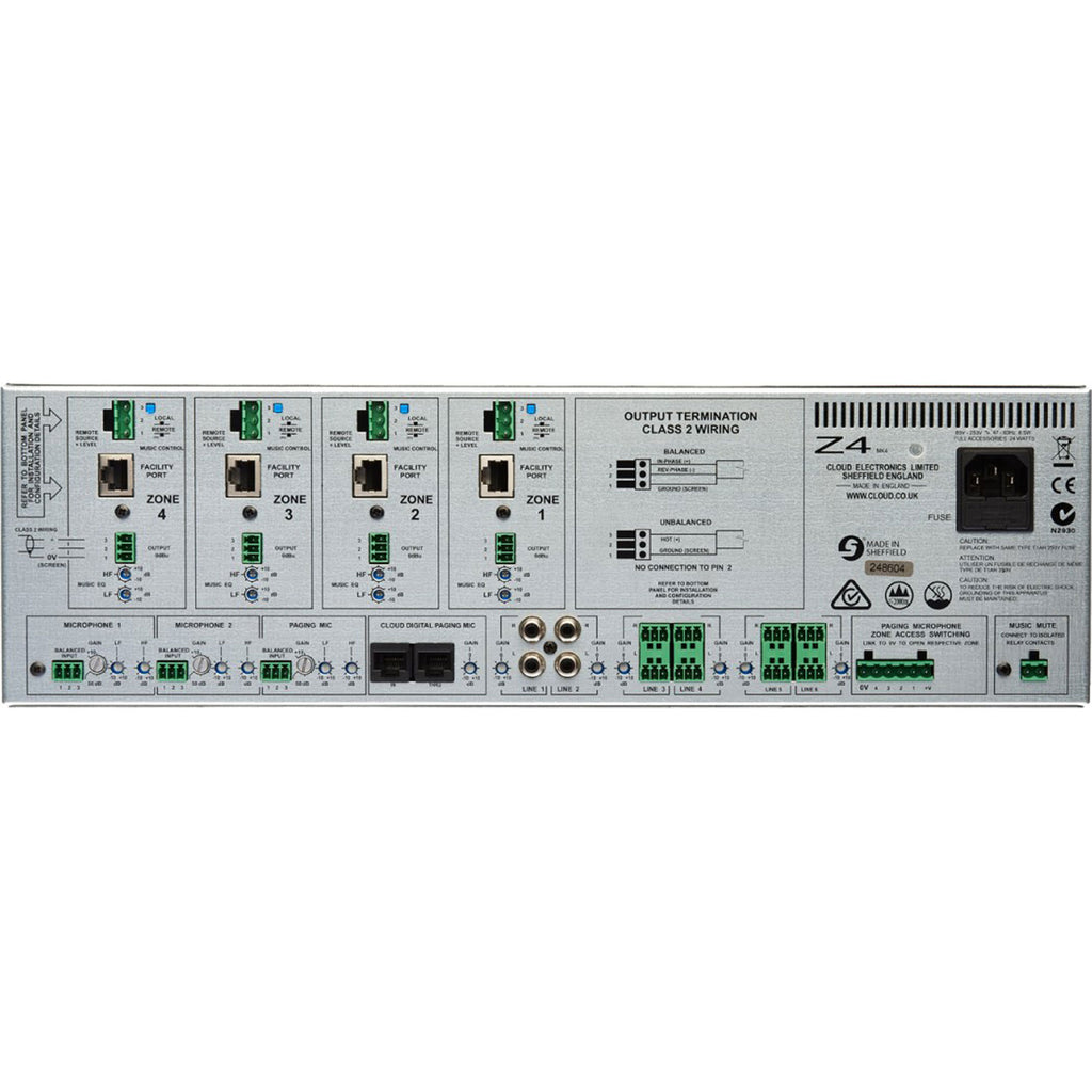 A new Universal Power Supply (85-254v) allows the Z4MK4 to be installed anywhere in the world, regardless of mains supply. The new up-rated power supply also provides increased output to support connection of up to 600mA of internal accessories such as EQ cards and external devices such as LM-2 Line/Mic/Remote Mixer Modules and Paging Consoles. The addition of a new RJ45 THRU/IN terminals allows for the simple connection of Cloud Digital Paging Microphones and the addition of four balanced inputs add to the flexibility and increased installer friendliness.