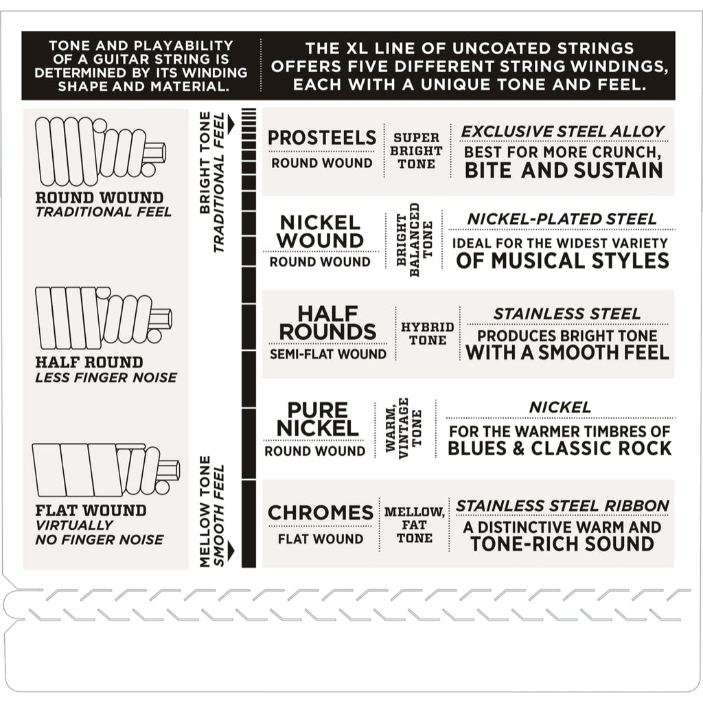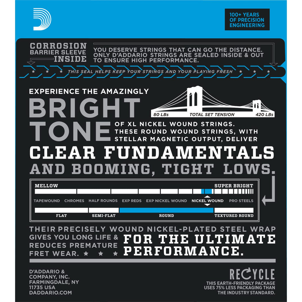 D'Addario XL Nickel Wound Electric Bass strings are world-renowned as "The Player's Choice" amongst bass players of all genres and styles. All XL strings are precision wound on our exclusive digitally-controlled machines, ensuring each string has excellent intonation, clear fundamentals, and unparalleled consistency. Each string is wound with a nickelplated steel wrap wire known for distinctive bright tone with excellent magnetic output delivering a universally appealing and versatile tone for all playing styles.