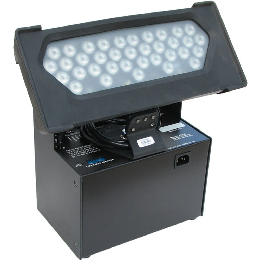 The totally wireless LED100 power supply is targeted at the event industry. Whereas wireless supplies intended for theater may power a luminary for several minutes, event power supplies must power the luminary for several hours. The LED100 powers a Color Kinetics ColorBlast 12 for six hours when on full (100% white) and 24 hours on a rolling color fade. Features include W-DMX wireless control, absorptive-glass-mat sealed lead acid batteries, a built in charger, a battery voltmeter, and a five year warranty.