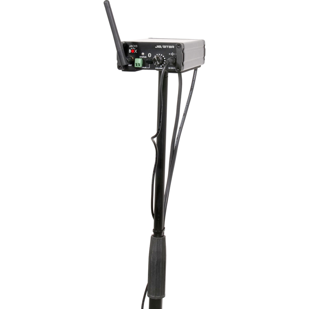 The JIB/BT8R is a lightweight, compact, portable stereo Bluetooth receiver that interfaces high quality stereo Bluetooth audio wirelessly from a smart phone to an active speaker or mixing console. The audio Bluetooth receiver offers a practical, straightforward audio solution for venues that require a quick wireless set up. Additionally, the receiver offers remote pairing capability by connecting to the included euro-block connector. The JIB/BT8R features balanced Left/Right XLR and 1/4" line outputs with a volume control. The compact stereo Bluetooth receiver is powered on 5V DC and comes with a removable 2.4GHz antenna. The portable Bluetooth receiver can be placed on a flat surface such as a rack shelf or mounted to a mic stand. DJs accepting requested songs that may not have it in their track can allow a user to Bluetooth a song straight to their mixing console for live DJ mixing. Singers and musicians can stream audio wirelessly to the receiver. The JIB/BT8R can also be used for a number of other audio streaming applications including dance studios, aerobics, school and gym classes, house of worship, restaurants, nightclubs, event spaces, karaoke, weddings, and many more.