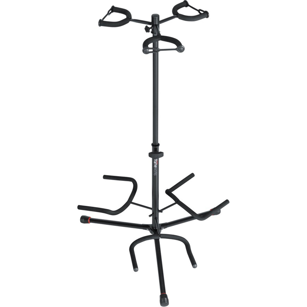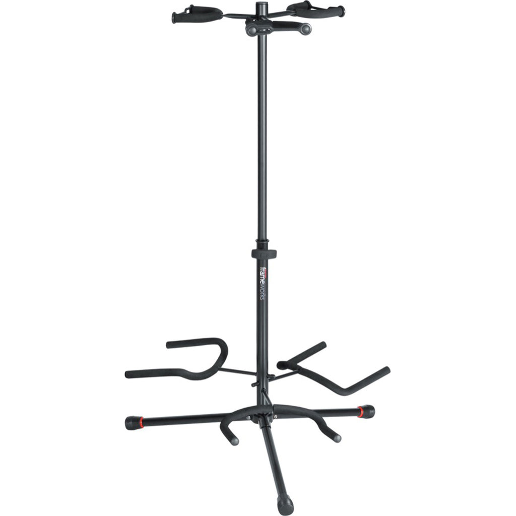 The Frameworks Triple Guitar Stand from Gator Cases is designed to hold three acoustic or electric guitars. It features steel construction as well as a neck restraint for added stability. The stand has rubberized cradle padding to help protect your instrument's finish while its feet have removable red safety trim.