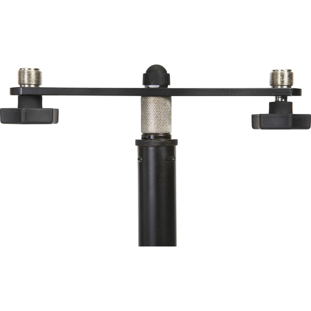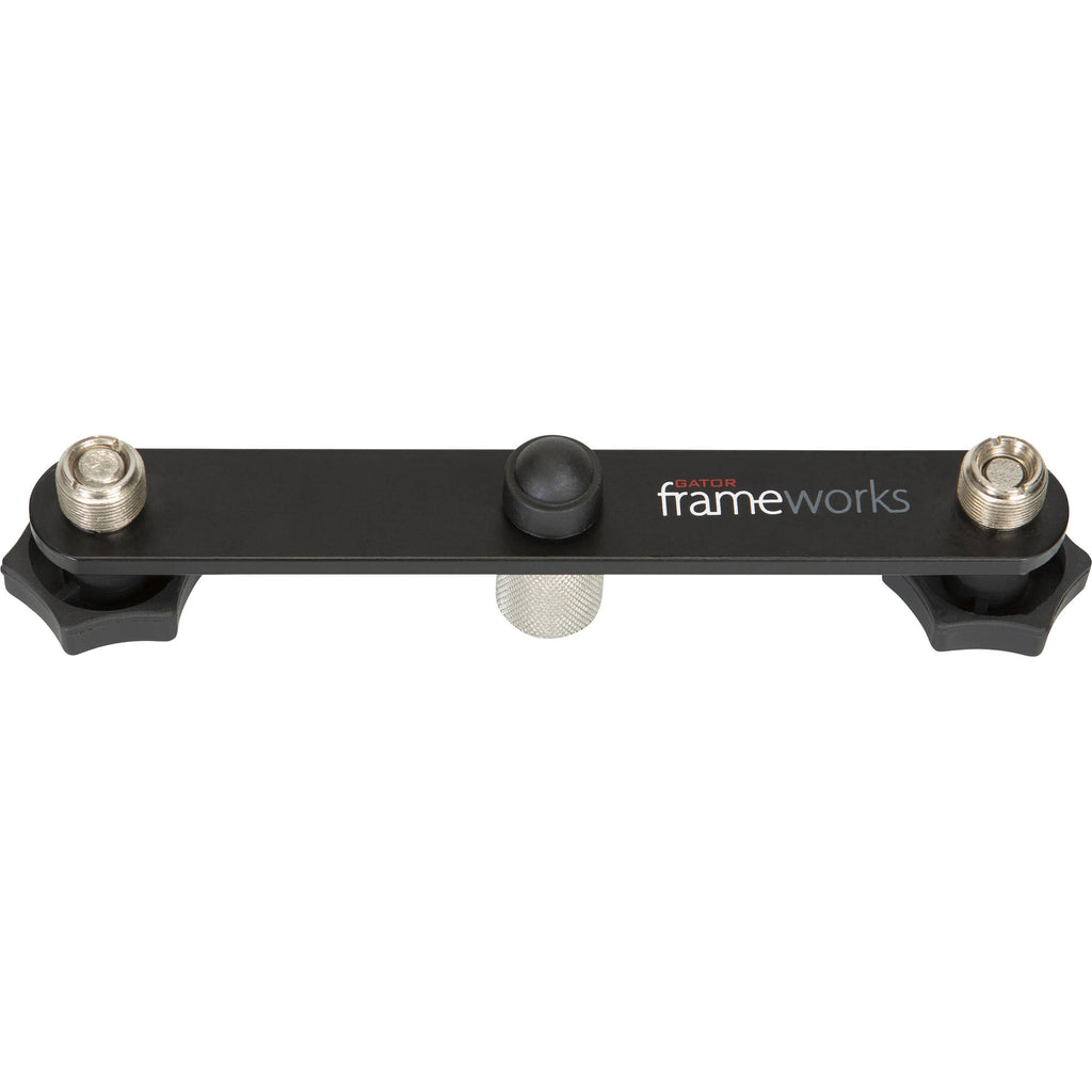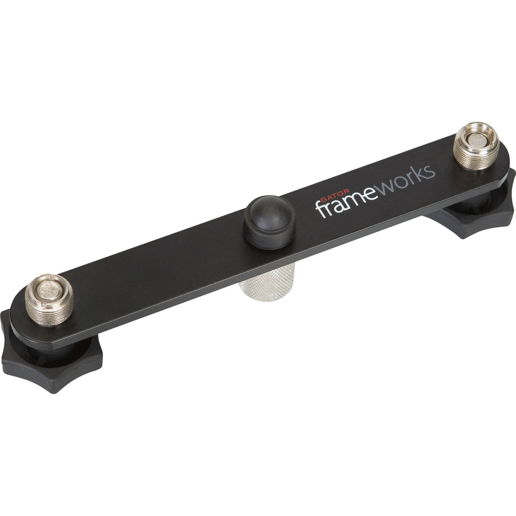 Designed for stage, studio, podcasts, broadcasts, and press conferences, the Gator Cases Frameworks Mic Mount Bar for 1-2 Microphones is a stereo microphone mount adapter bar that allows you to attach up to 2 evenly spaced microphones with 5/8"-27 male threads. The bar fits on any standard 5/8"-27 mic stand is constructed from sturdy, lightweight aluminum with a black powder coat finish. Soft-touch adjustment knobs help with mounting and securing microphone clips.