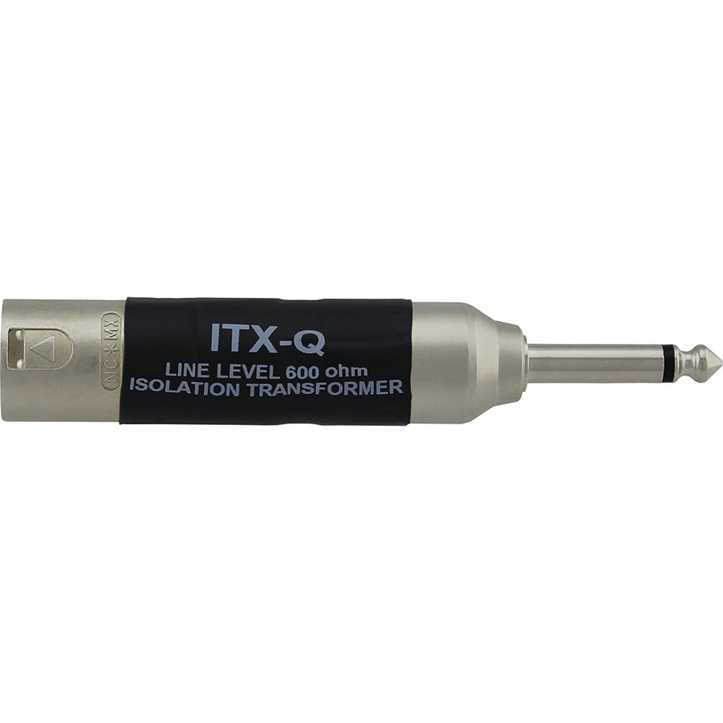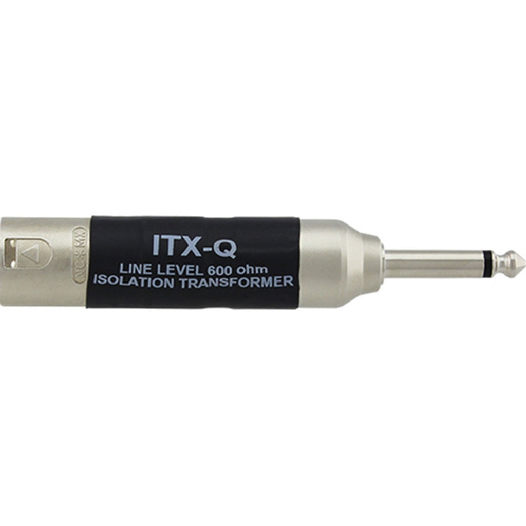 ITX is a compact custom-made audio isolation transformer providing a floating XLR-type output from an unbalanced source in a convenient package. ITX-Q is the same as ITX, but with a 1/4" ( diameter6.35mm) phone plug input. Male XLR-type output. Tip wired in-phase with pin-2. Usable for 600 ohms 1:1.