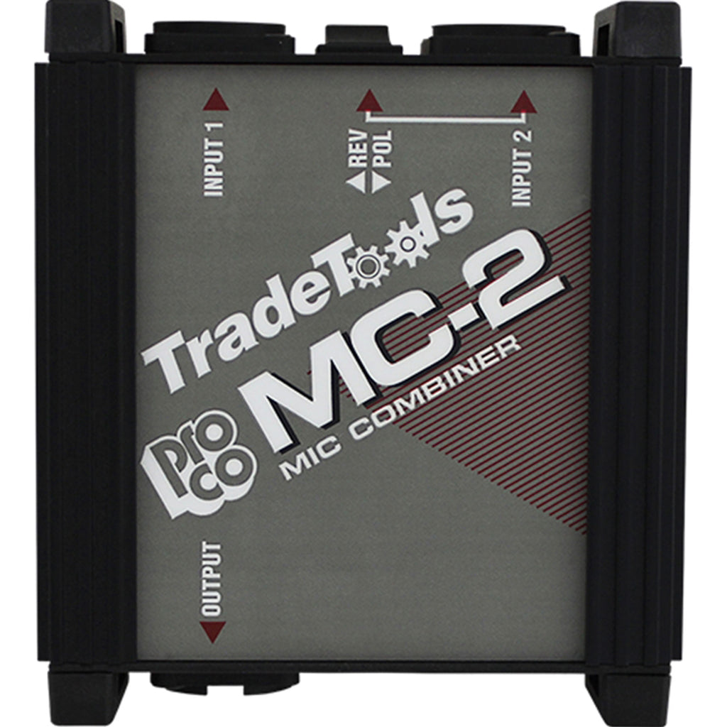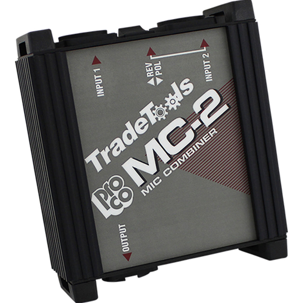 The ProCo TradeTools MC2 Mic Combiner passively combines the signals from two low-impedance microphone (or similar sources) into a single output. It is a handy "band-aid" for situations where the number of microphones required exceeds the number of mixer channels available, but separate equalization and level control for every microphone is not required. In a musical or recording situation, the MC2 can combine mics from sources like dual bass drums, percussion, stereo guitar amps, etc. Commercial sound uses include combining dual mics on a public speaker for redundancy and handling extra mics for audience participation at meetings. The MC2's transformer isolation minimizes interference from EMI/RFI and ground loops, retaining the advantages of common-mode noise rejection inherent in the use of balanced lines.