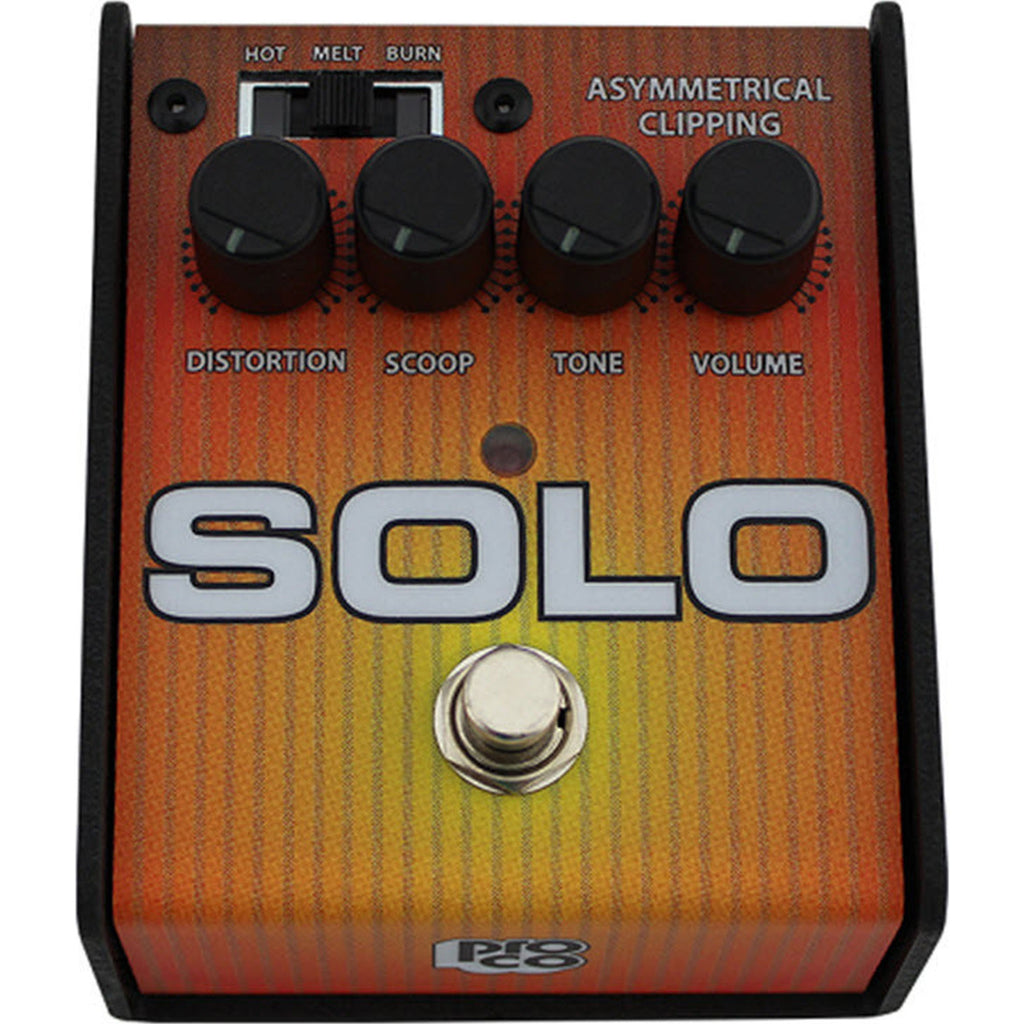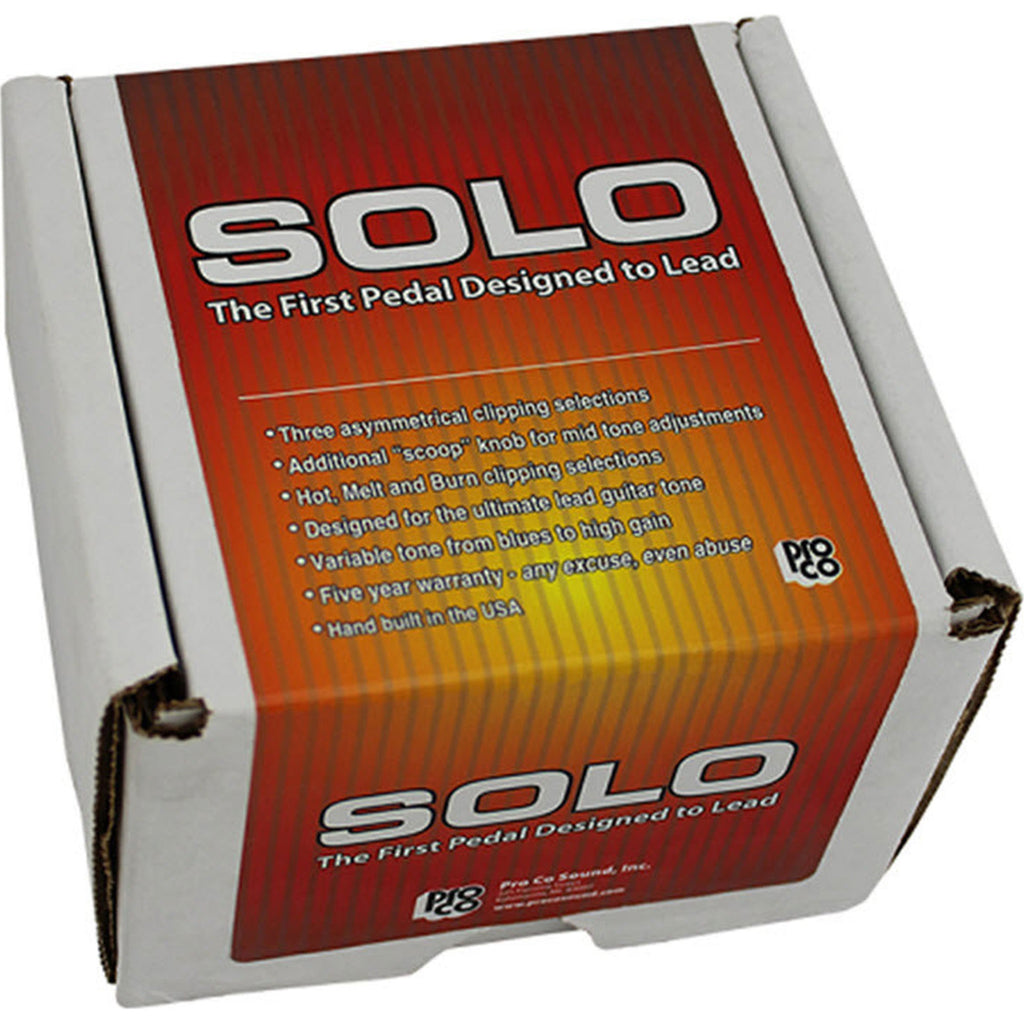 The SOLO is the newest member of the ProCo family of stomp boxes. Although it is housed in the same indestructible and road worthy steel enclosure that has come to be a trademark of ProCo stomp boxes, the SOLO marks a departure from the RAT series of pedals in more ways than just the new cosmetics. With its enormous range of tones, 3 way selectable clipping modes ("hot, melt, & burn"), and highly interactive "scoop" and "tone" controls, the SOLO just might be the most versatile pedal in your arsenal.
