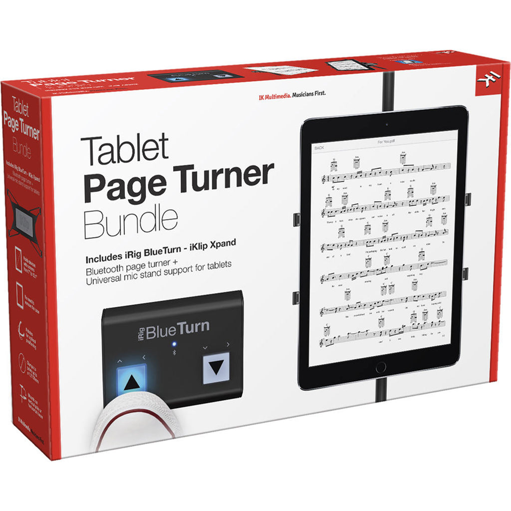The Tablet Page Turner Bundle from IK Multimedia packages the iKlip Xpand Universal Mic Stand Mount for Tablets with the iRig BlueTurn Wireless Page Turner, therefore providing everything you'd need to read sheet music off your tablet while simultaneously turning digital pages with the tap of your toe.