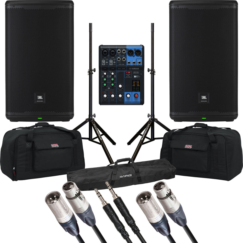Exclusive Dual JBL EON712 PA Mobile 12" Loudspeaker Bundle Savings Package with Mixer, Speaker Stands, Cases and Cables. Everything You Need to Make It Loud!