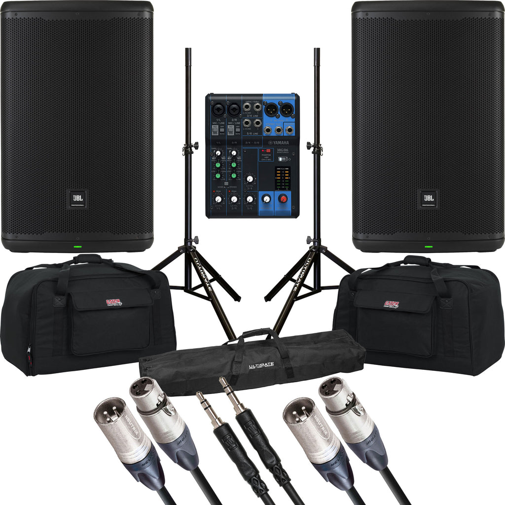 Exclusive Dual JBL EON715 PA Mobile 15" Loudspeaker Bundle Savings Package with Mixer, Speaker Stands, Cases and Cables. Everything You Need to Make It Loud!
