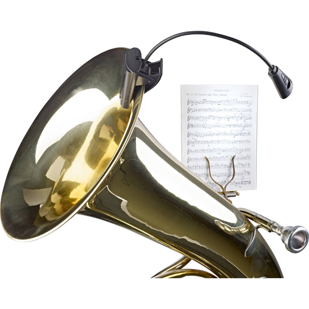 Versatile light with 2 extra bright and long-lasting LEDs rated for 100,000 hours. The flexible gooseneck provides an extremely variable adjustable light beam. The extra wide clip (up to 25 mm) attaches to music desks, table tops etc. It can also be used as a standing light. Very compact and easy-to-use. Includes 3 batteries (1.5 V AAA) with a battery life of up to 20 hours. Powered also by AC adapter (not included).