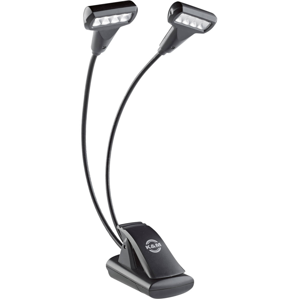 The black K&M 12273 Dual 4-LED T-Model FlexLight is a dual-gooseneck lamp with a wide clip at the base that's ready to attach to music stands, desktops, keyboard stands, shelves, or just about anywhere you need a quick and easy light solution. Each four-LED lamp offers two levels of brightness and is rated for 100,000 hours of pleasant, warm-white light equal to a color temperature of 3000K. The three included AAA batteries will power the unit light for up to 10 hours of use. The light can also be powered via AC adapter (available separately).