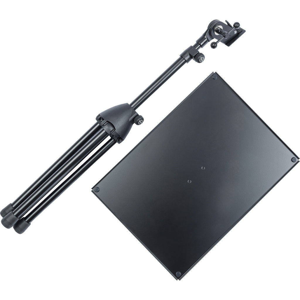 The convenient and comfortably sized laptop rest of 400 x 290 mm is large enough to hold notebooks, laptops or similar products in a range of sizes. The V-shaped connector means the laptop rest can be quickly detached for transport. Its angle can also be altered to any position with the clamping lever. The stable 3-legged base section folds compactly.
