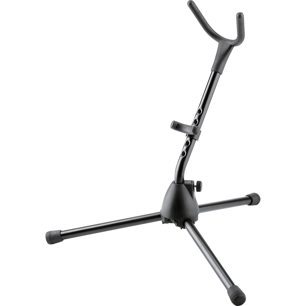 Adjustable folding stand for Eb Alto and Bb Tenor Sax. Fiberglass reinforced plastic base. Flexible upper support arm for different bell sizes. Lower support arm bracket with several vertical locking positions. All instrument support parts covered with exclusive non-marring plastic coating. To be used with peg holder 14301 and clarinet peg or with peg holder, adapter 15281 and pegs for trumpet, soprano sax or flugelhorn.