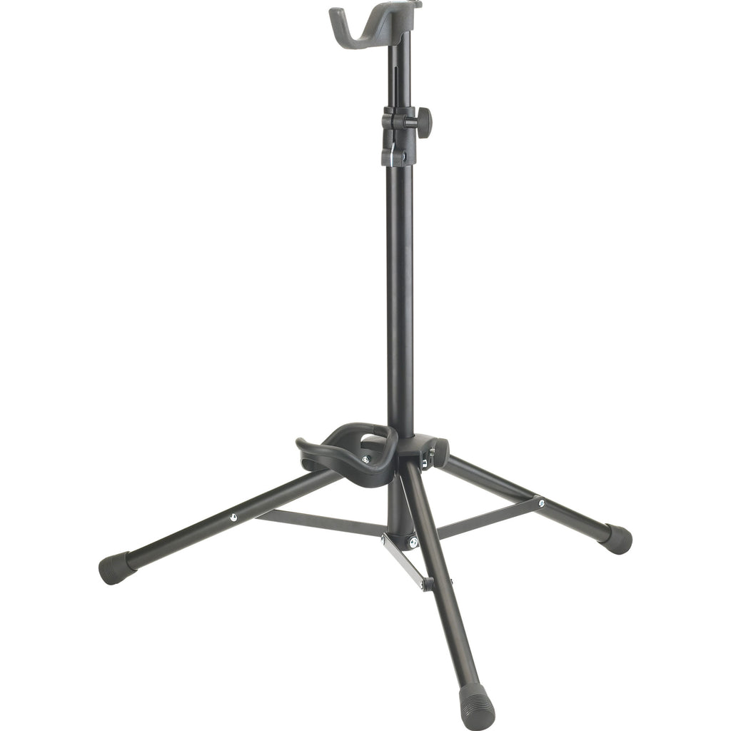 A tenor or baritone horn is supported safely and securely by this robust support stand. The functional instrument support incorporates a stable metal bracket wrapped in a particularly soft material to protect the instrument body. The integrated mouth piece holder is a useful extra. The lower instrument support is again a combination of stable metal and soft rubber profile. The instrument body is protected as it is held in position. The stand can be adjusted to a height suitable for the instrument using the continuous height adjuster. The one-piece, non-dismantable item folds to a small size.